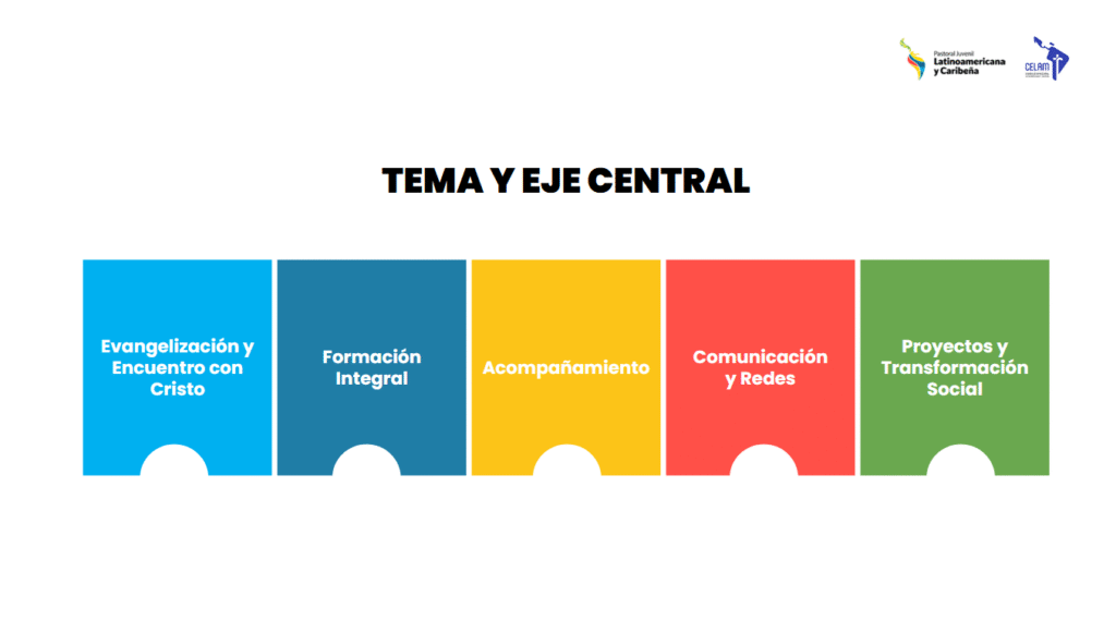 Evangelización y Encuentro con Cristo, Formación Integral, Acompañamiento, Comunicación y Redes, y Proyectos y Transformación Social.